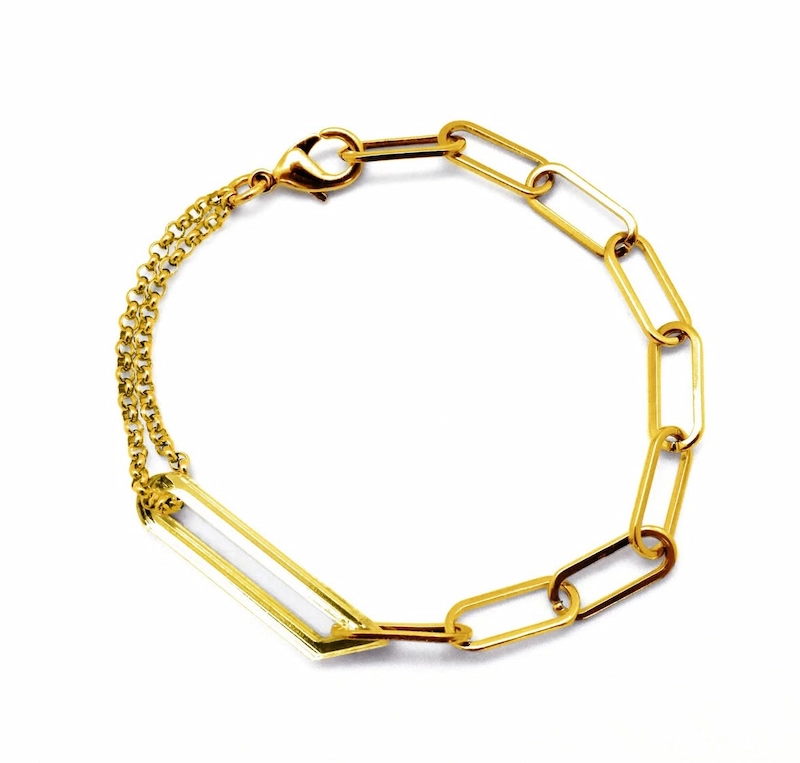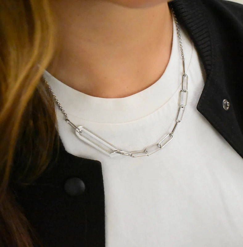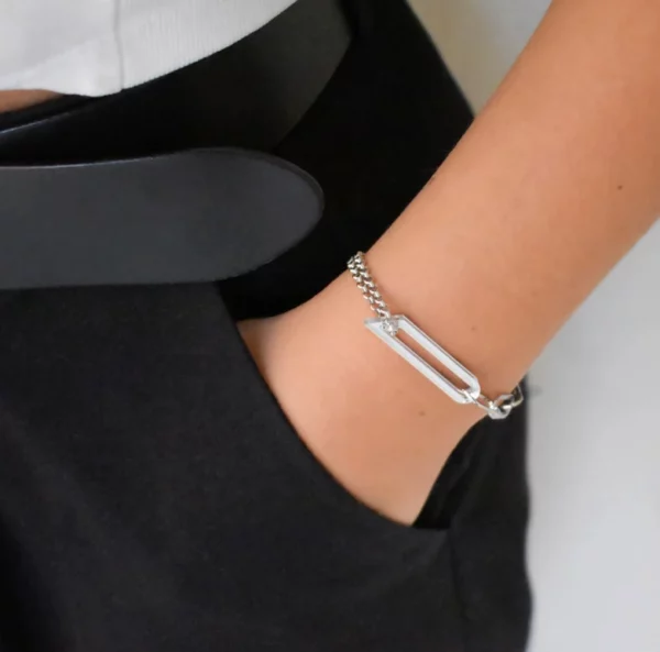 Création exclusive de la marque Tell Mee – les colliers et bracelets Air proposent un désign épuré et léger – doux mélange de maillons argentés ou dorés et d’un maillon plus large en plexi.