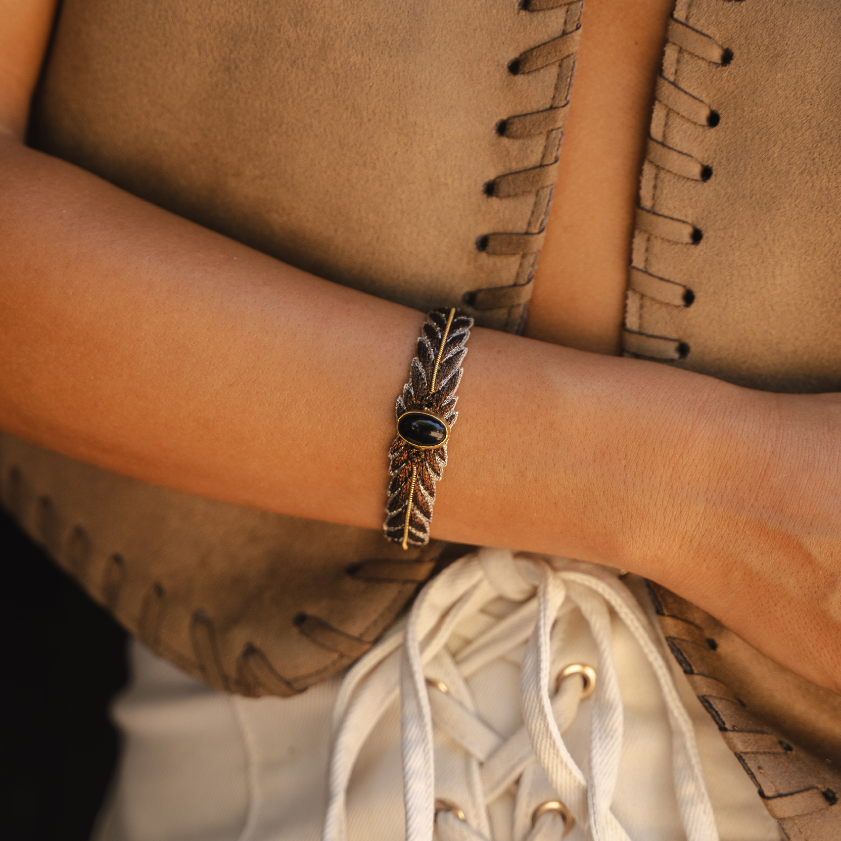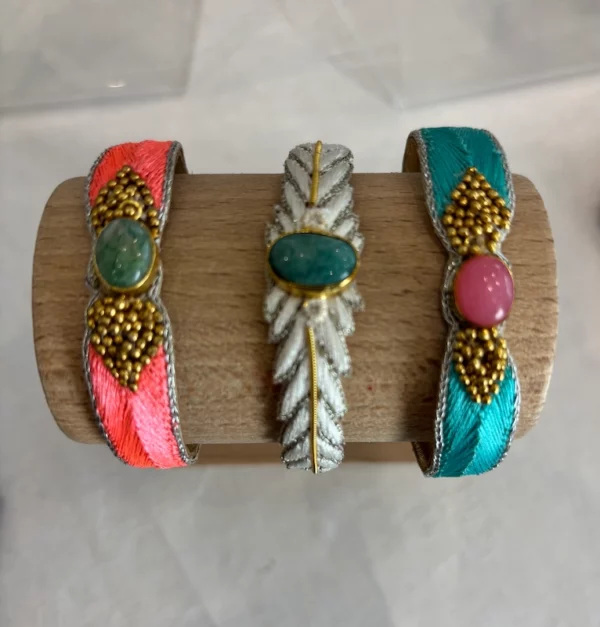 Bracelet / jonc coloré et tissé de la marque française Nahua – véritable pierre naturelle au centre du jonc.