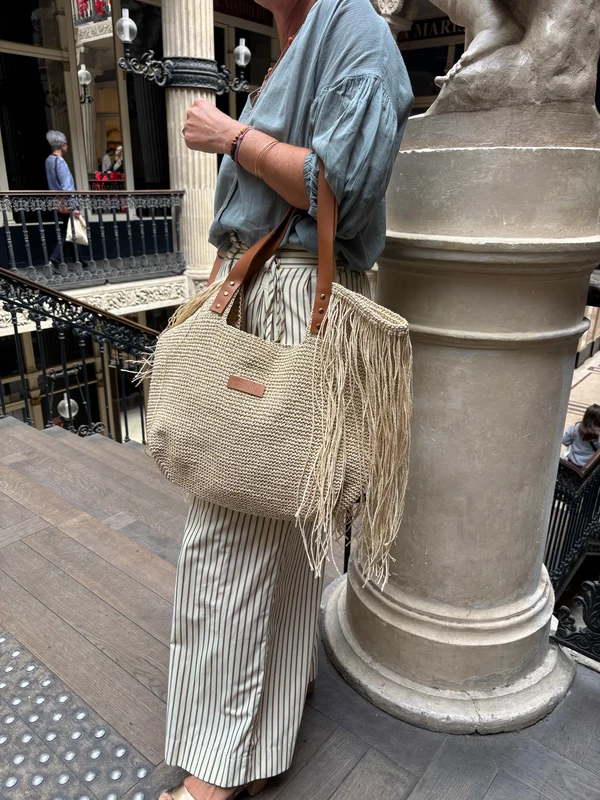 Un cabas en raphia, très léger et très tendance avec ses franges sur les côtés. Sa dimension est parfaite pour le prendre en ville en version sac à main, ou à la plage en version balade estivale.