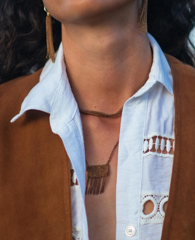 Le collier Palma en Maille est une création exclusive de la marque française Maison Bivouac. Tissé à la main, il est composé de fines chaines en laiton ou en acier inoxydable et de fils lurex.