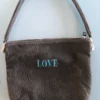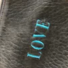Pochette en cuir bubble – grise – brodée en fils turquoise du mot « love ». Fermeture zippée. Fabrication artisanale à la main.