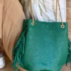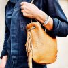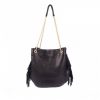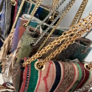 Sac seau en cuir Bubble – cuir de différentes couleurs (selon le stock en séries limitées) & chaîne argent ou or (selon choix du colori du cuir) – entièrement doublé avec une poche à l’intérieur.