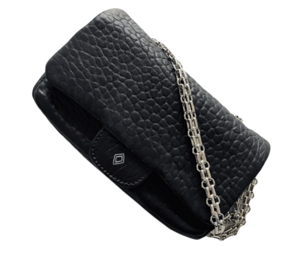 Le dernier né de la marque française Junon : le Mister Rock – un sac en cuir Bubble avec une chaîne argentée – entièrement doublé avec une poche à l’intérieur.
